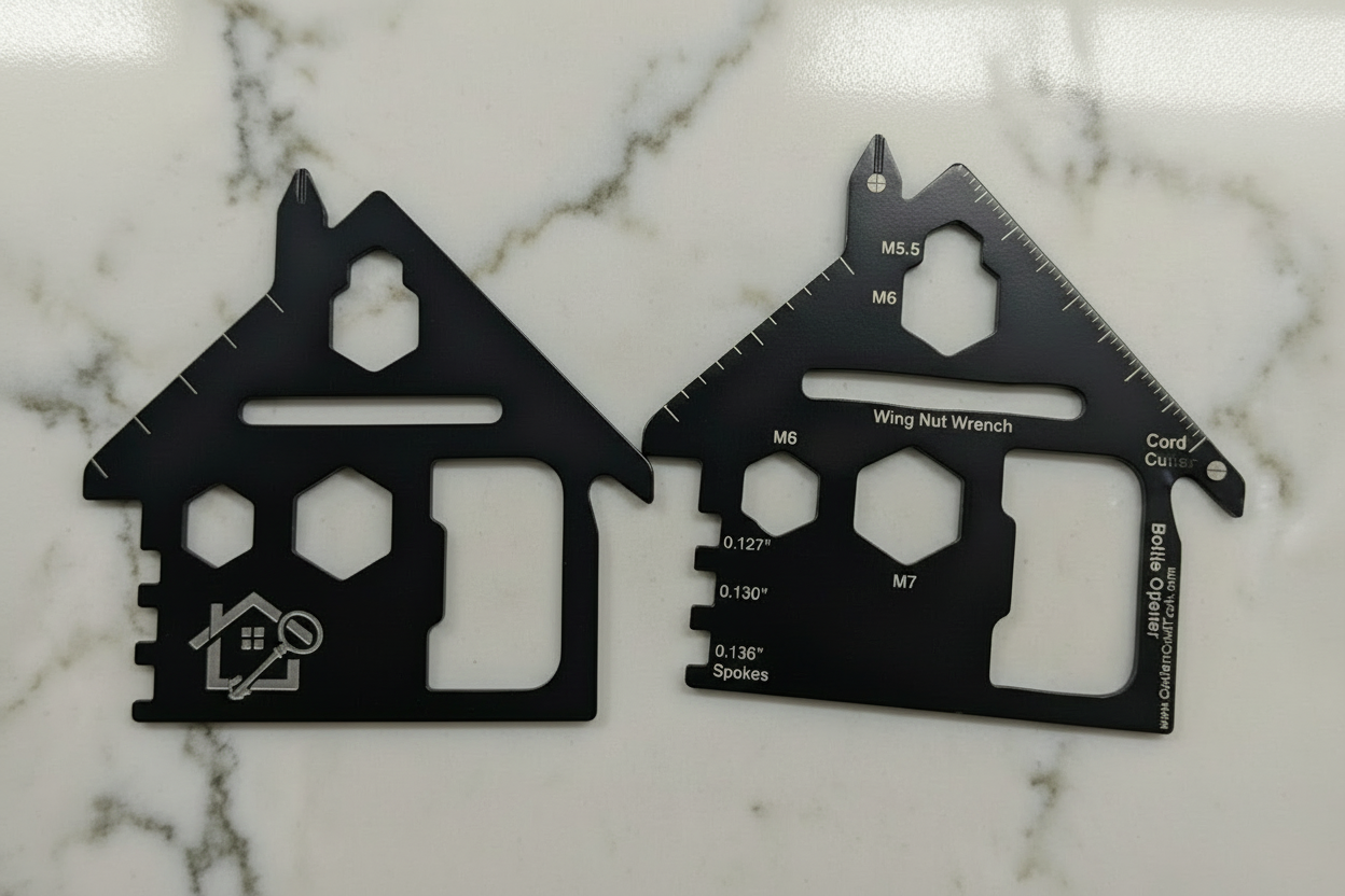 When potential buyers visit five homes in a day, they collect a stack of paper cards. Hand them a metal tool card, and you become the one agent they remember vividly.
